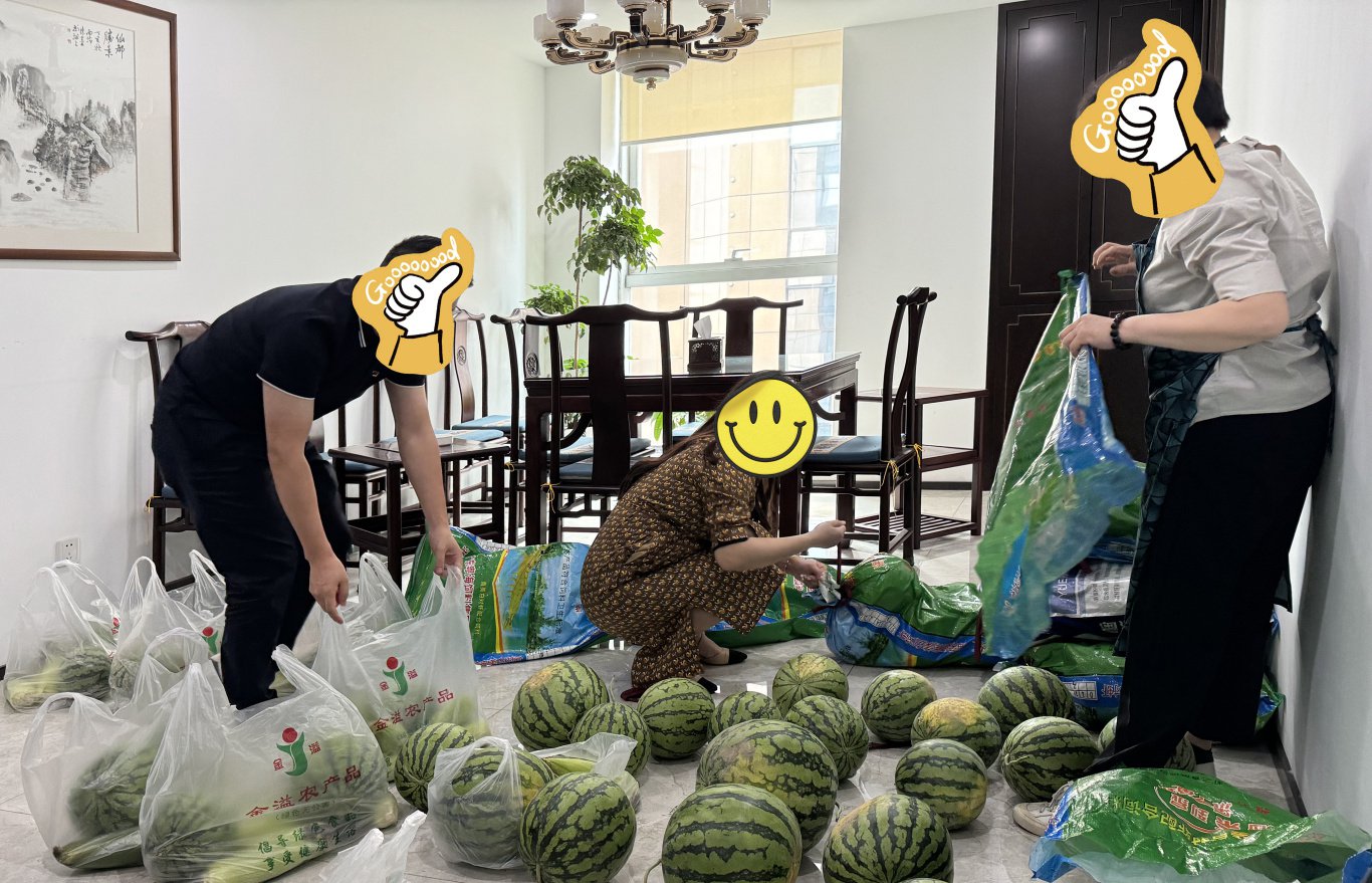 由于高溫下工作容易流失體內水分和電解質,因此,公司精心準備了集團農業基地產的西瓜和玉米,為員工們補充能量,解渴降溫。