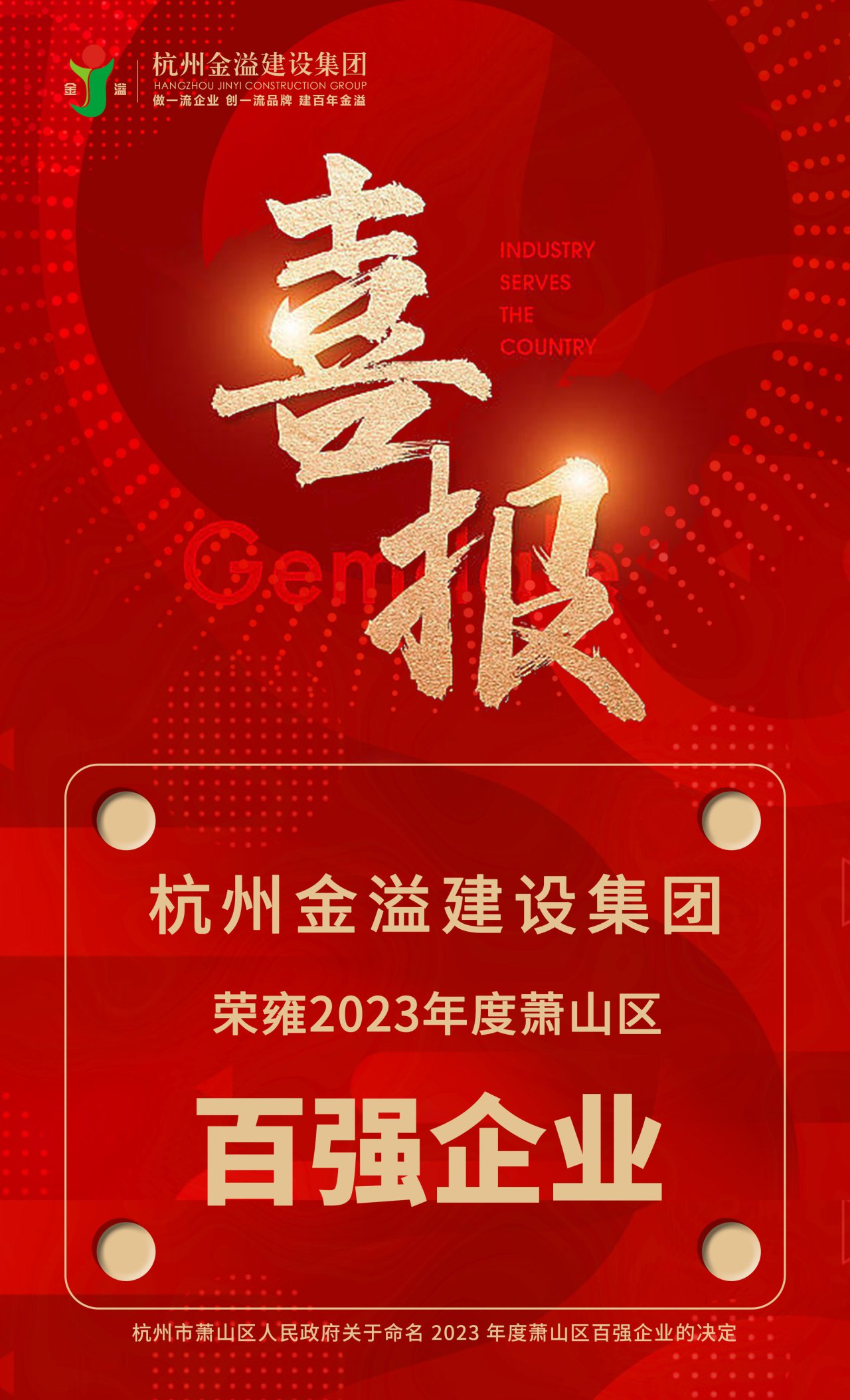 為鼓勵在經濟發展中作出突出貢獻的先進企業,樹立榜樣引領,根據《2023年度蕭山區百強企業評選辦法》精神,經各相關部門考核,區委、區政府于近日發布了“2023年度蕭山區百強企業名單”,杭州金溢建設集團再次上榜。