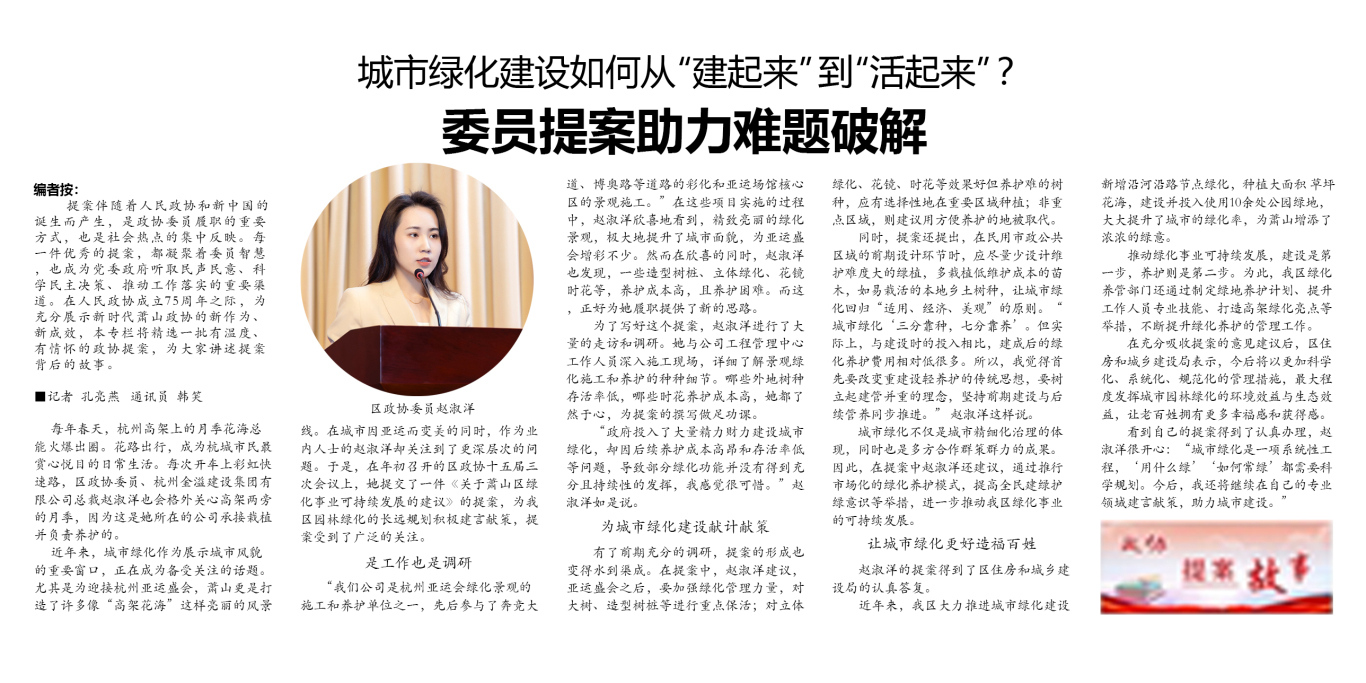 為了解決這些問題,趙淑洋在蕭山區(qū)政協(xié)十五屆三次會(huì)議上提交了一份提案《關(guān)于蕭山區(qū)綠化事業(yè)可持續(xù)發(fā)展的建議》。在撰寫提案的過程中,她進(jìn)行了大量的走訪和調(diào)研,她與公司工程管理中心工作人員深入施工現(xiàn)場(chǎng),詳細(xì)了解景觀綠化施工和養(yǎng)護(hù)的種種細(xì)節(jié)。哪些外地樹種存活率低,哪些時(shí)花養(yǎng)護(hù)成本高,她都了然于心,為提案的撰寫做足功課。