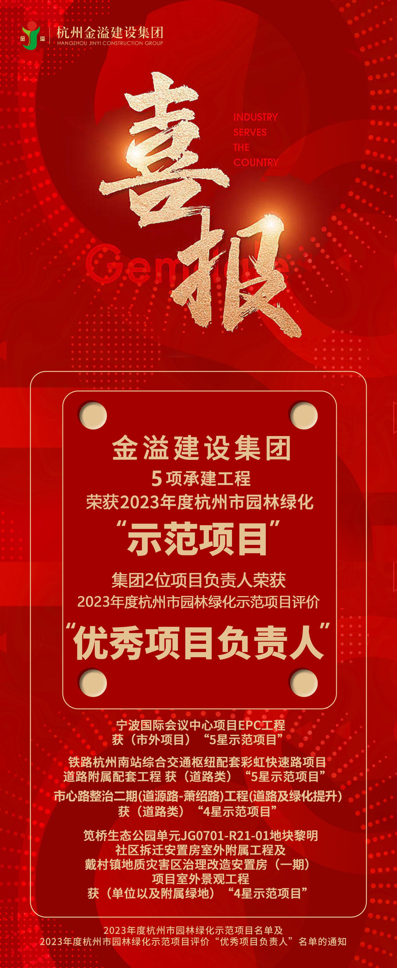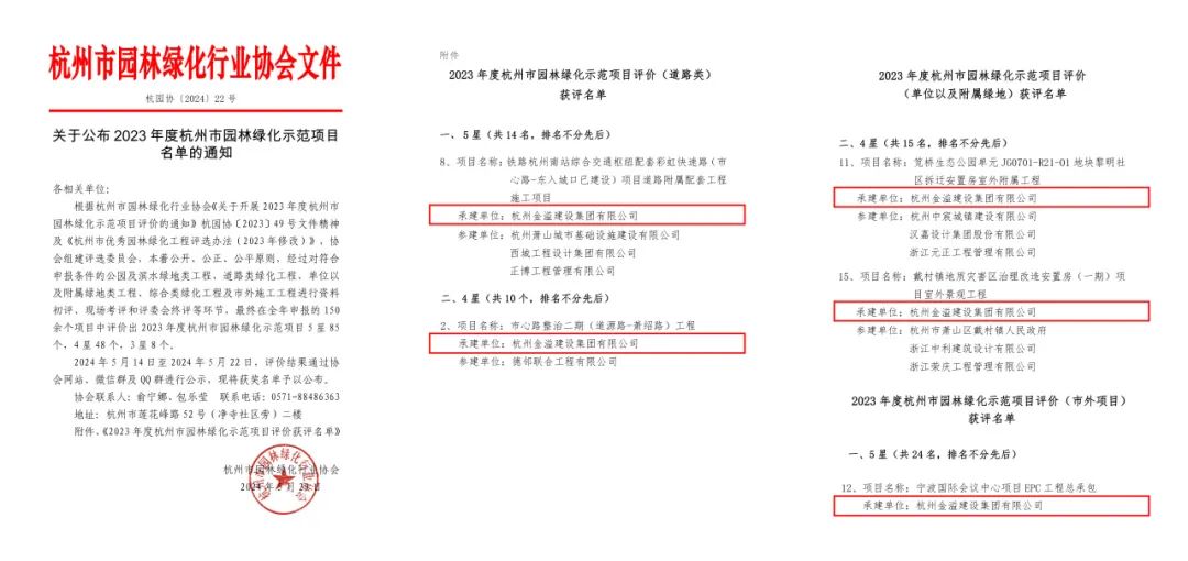 近日,杭州市園林綠化行業協會公布了2023年度“杭州市園林綠化示范項目”名單及2023年度杭州市園林綠化示范項目評價“優秀項目負責人”名單的通知,經過材料初審、現場評審、綜合評定和社會公示等環節,由金溢建設集團承建的5項工程榮獲2023年度“杭州市園林綠化示范項目”獎項,集團2位項目負責人榮獲2023年度杭州市園林綠化示范項目評價“優秀項目負責人”。