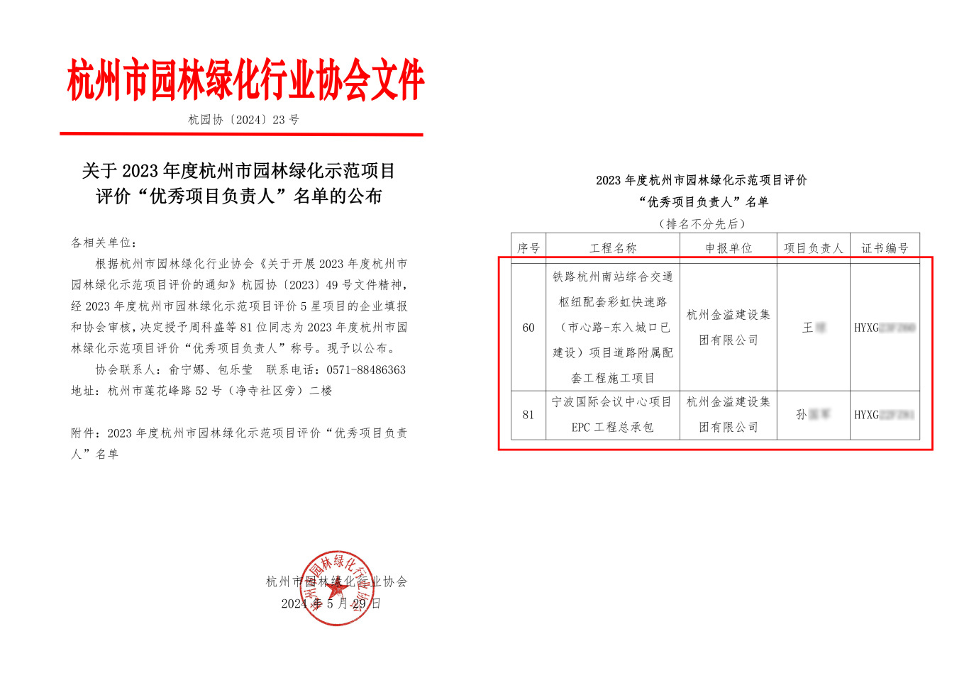 根據杭州市園林綠化行業協會《關于開展2023年度杭州市園林綠化示范項目評價的通知》杭園協〔2023〕49號文件精神及《杭州市優秀園林綠化工程評選辦法(2023年修改)》,對工程進行資料初評、現場考評和評委會終評等環節,評選出2023年度杭州市園林綠化示范項目名單及2023年度杭州市園林綠化示范項目評價“優秀項目負責人”名單。