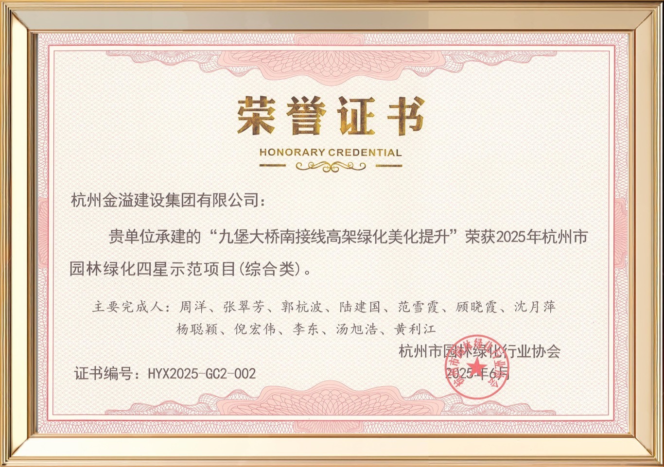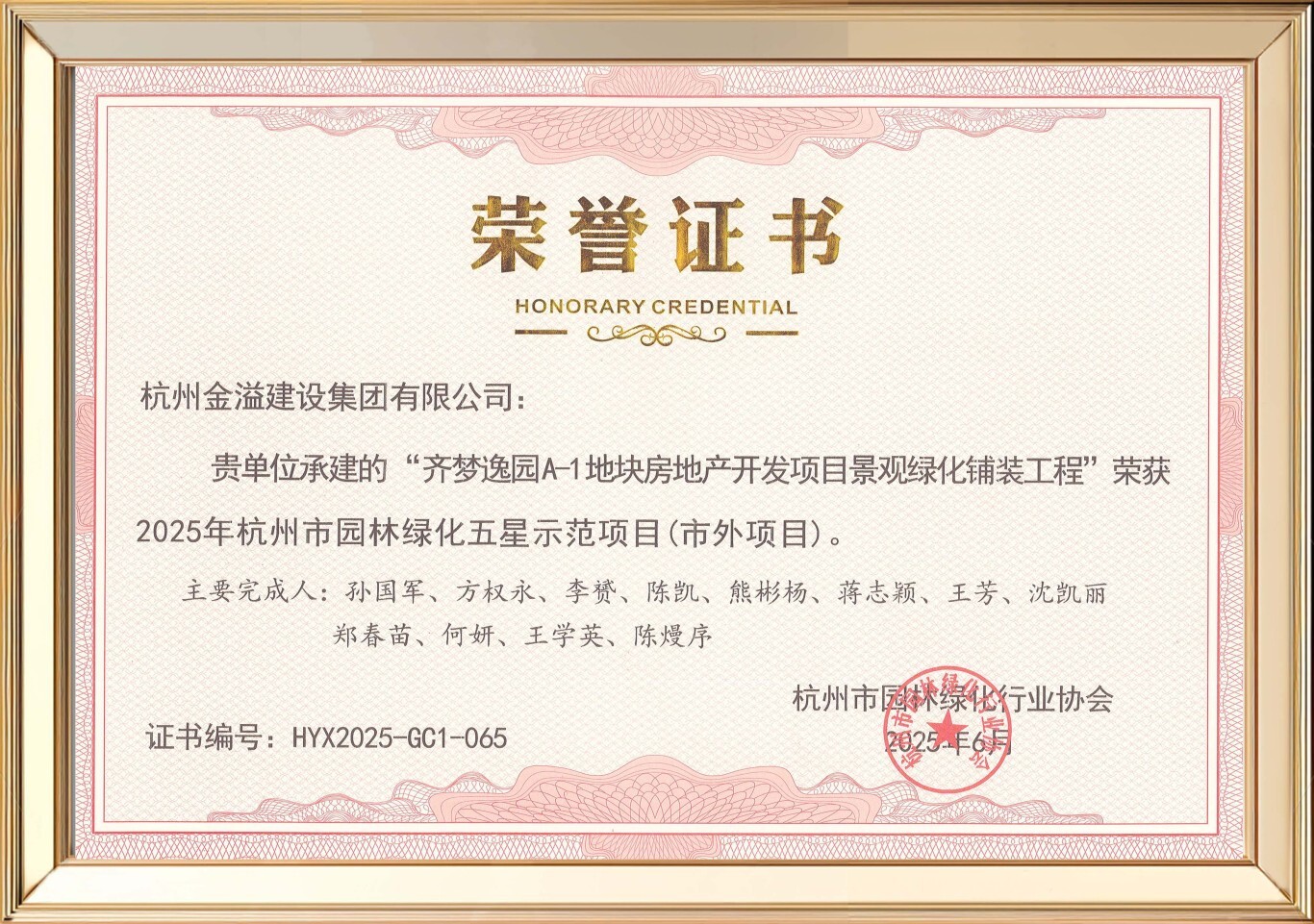 近日,杭州市園林綠化行業(yè)協(xié)會公布了2025年度“杭州市園林綠化示范項目”名單,經(jīng)過材料初審、現(xiàn)場評審、綜合評定和社會公示等環(huán)節(jié),由金溢建設集團承建的3項工程榮獲2025年度“杭州市園林綠化示范項目”獎項。